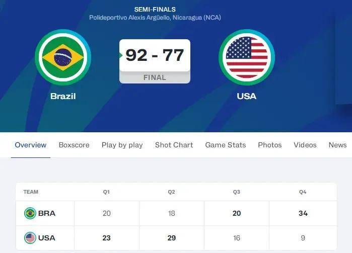 赛后技术统计上,美国男篮只有3人得分上双,分别是加洛韦的22分、格兰特11分,以及斯马特13分。巴西男篮则是4人得分上双,卡波克洛狂轰20分9篮板,桑托斯贡献25分12助攻的豪华两双数据,加上迪亚斯18分、保拉13分,帮助球队取得一场精彩的胜利。