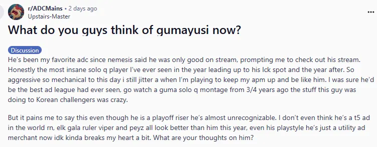 自从Nemesis说他只在直播里厉害,我就去看了他的直播,从那时起他就成了我最喜欢的AD。说实话,在他打上LCK前一年和之后一年里,他是我见过最疯狂的排位选手。他的打法那么激进,操作那么细腻,直到今天我玩的时候还会紧张得手抖,想保持高APM像他一样。我当时确信他会是英雄联盟有史以来最强的AD,去看看三四年前Guma的排位集锦吧,这家伙在韩服王者局里做的那些事简直太疯狂了。