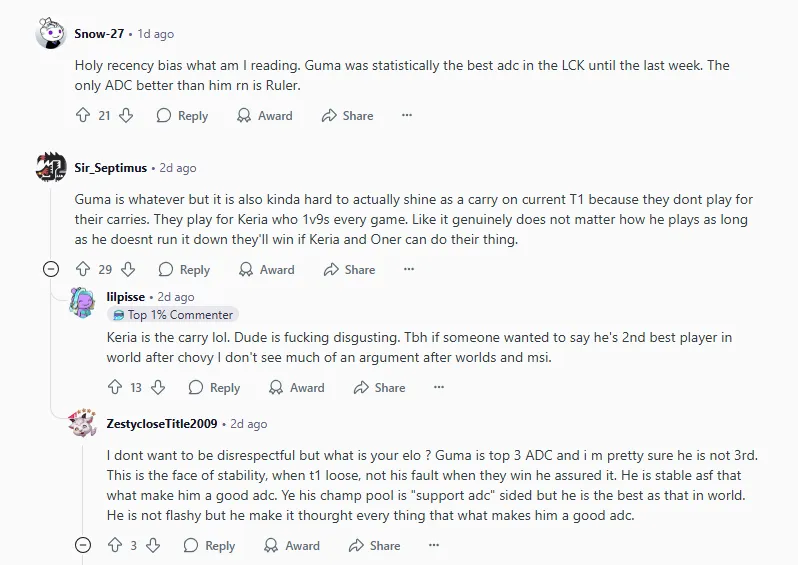 我不想冒犯,但你的段位是多少?Guma是前三的AD,而且我很确定他不是第三。他就是稳定的代名词,T1输了,不是他的错;T1赢了,他功不可没。他非常稳定,这就是他成为一个好AD的原因。是的,他的英雄池偏向“功能型AD”,但他是世界上这方面最强的。他可能不那么华丽,但他能搞定一切,这就是他成为一个好AD的原因。