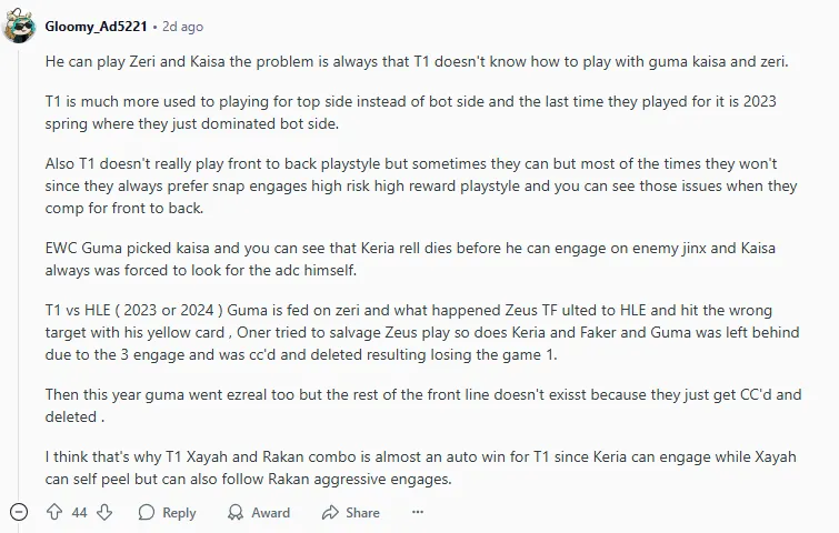 他能玩泽丽和卡莎,问题是T1就是不知道怎么围绕Guma的卡莎和泽丽来打。