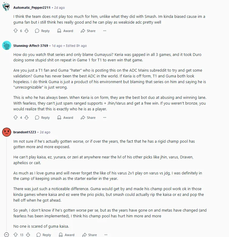 你是不是只是个T1粉丝兼Guma“黑粉”,跑到ADC区发帖想找认同?Guma从来都不是世界第一AD。如果Keria状态不好,T1和Guma看起来都指望不上了。我确实觉得Guma就是环境的产物,但把那一系列比赛的锅甩给他,说他“判若两人”就太错了。